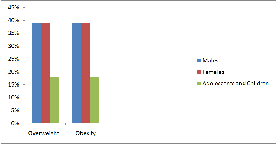According to the WHO, there are nearly more than 600 million adults with BMI exceeding 30. The data from Global Health Observatory (GHO) states that the Prevalence rate of overweight adults In 2016 was 39% of women and 39% of men aged 18 and over, while the Prevalence rate of overweight adolescents and children aged 5-19 in 2016 was 18 %. The Prevalence rate of obesity among adults In 2016 was 39% of women and 39% of men aged 18 and over while the Prevalence rate of obesity among children and adolescents aged 5-19 in 2016 was 18% .